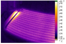 汽車開發工程師可以利用紅外熱像儀快速、方便的獲取后風擋在電阻絲加熱過程中的熱像,分析電阻絲的溫度場分布,整塊玻璃的溫度上升趨勢。避免由于電阻絲分布不均勻或某點電阻出現異常,造成玻璃局部受熱,到一定溫度階段,玻璃可能會發生損壞;如果電阻絲加熱過快而導致玻璃內部溫升過快,而玻璃表面的溫度變化較小時,就會由于熱脹冷縮的原因,導致玻璃發生炸裂。