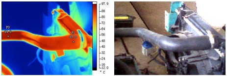 進水管是將發(fā)動機出來的高溫冷卻水,通過水散熱器靠風(fēng)扇強力鼓風(fēng)來冷卻,冷卻后的水再去冷卻發(fā)動機。利用熱像儀檢測進水管的溫度,可以調(diào)解風(fēng)扇的轉(zhuǎn)速,達到完善散熱器的風(fēng)扇設(shè)計目的。