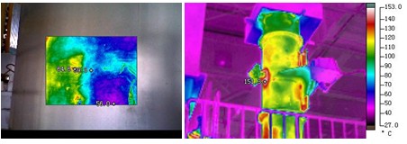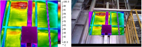 利用I系列紅外熱像儀對加熱爐表面進行分區塊的檢測,并通過紅外分析軟件,對得到的熱圖像進行溫度分布的分析。通過爐皮表面的不同變化,可以直接判斷有無內襯缺陷。如果某部位拍攝的熱圖對比溫度明顯上升,可以認定爐內襯已有損壞侵蝕。
