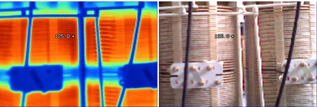 4 變壓器因鐵芯絕緣不良引起的發熱:干式變壓器出現這種情況時,其熱譜圖是以缺陷部位為中心的局部溫度升高,對于油浸式變壓器需在吊罩后施加一定的試驗電壓才能觀測到鐵芯的絕緣損壞情況,所以最好配合變壓器的大修進行確定。