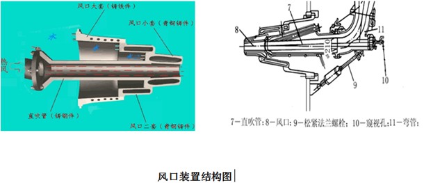 高爐風(fēng)口裝置是高爐最重要的動力設(shè)備。它不但直接提供高爐冶煉所需的氧氣,而且提供克服高爐料柱阻力所需的氣體動力。現(xiàn)代大、中型高爐所用的鼓風(fēng)機,大多用汽輪機驅(qū)動的離心式鼓風(fēng)機和軸流式鼓風(fēng)機。風(fēng)口裝置(儲存熱量)作為煉鐵最前一個工藝,是把含有氧氣、煤粉等高溫氣體傳遞給高爐,進風(fēng)口分為熱風(fēng)微管、上接口、中接口、下接口、彎頭、直吹管,然后進入爐體。