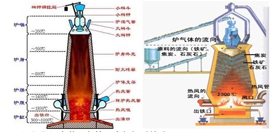 高爐是一種生產液態生鐵的鼓風豎爐,它的形狀像一個筒。煉鐵的方法就是從爐頂加入礦石、焦炭和石灰石,從爐底部向爐內通入加壓空氣,在焦炭燃燒時,礦石、石灰石與焦炭一起發生反應,最終形成鐵水和爐渣。高爐的工作空間是用耐火材料砌筑而成的。現代高爐爐型由爐缸、爐腹、爐腰、爐身和爐喉五段組成。其中爐缸、爐腰和爐喉呈圓筒形,爐腹呈倒錐臺形,爐身呈截錐臺形。