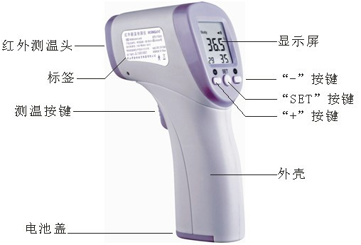 該測溫儀是專為無需接觸人體而設(shè)計(jì)的,測量人體身體額頭及體表溫度的體溫計(jì)。